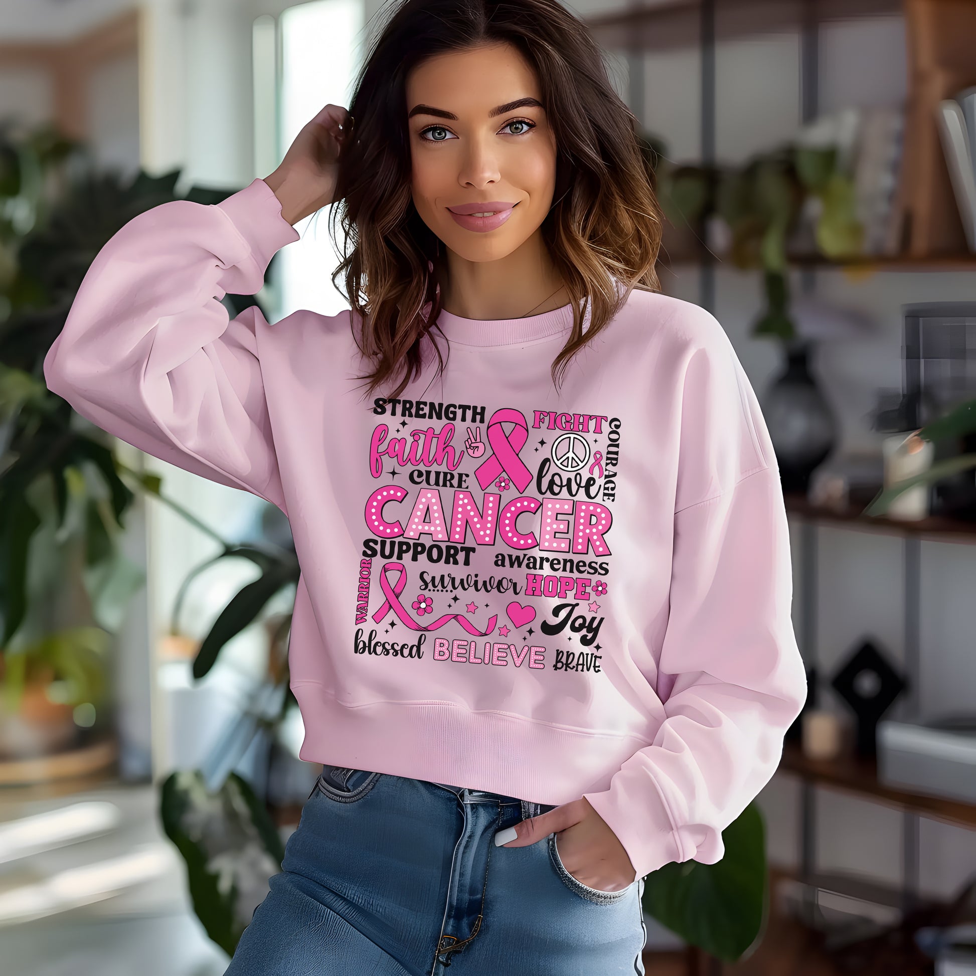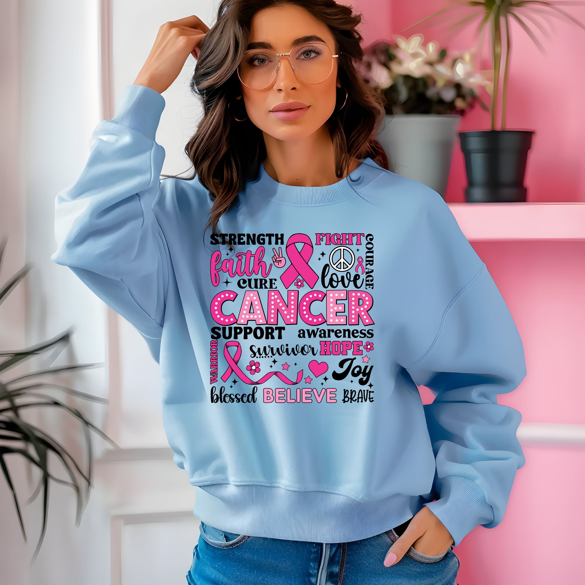 Embrace comfort and style with this cozy inspirational Cancer Awareness Crewneck Sweatshirt, perfect for those chilly days. Designed with a heartfelt message, it cultivates an atmosphere of support and hope, ideal for anyone who values community and resilience. This sweatshirt seamlessly fits into casual outings, cozy nights in, or even spirited gatherings like cancer awareness events. It's suitable for adults who appreciate both fashion and comfort, making it a thoughtful gift for friends or family battling cancer or simply wanting to spread positivity. Perfect for occasions like Breast Cancer Awareness Month, everyday wear, or as a motivational piece in your wardrobe.